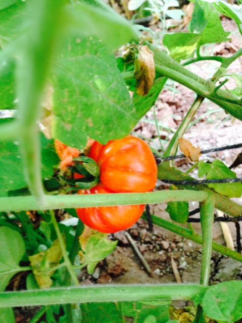 Yağmurlarda hastalanmıştı. Şimdi toparlanmaya çalışıyor. 4 fideden ikisinde ikişer domates var.