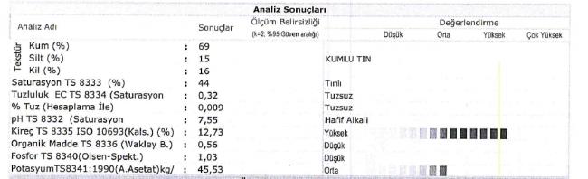 Sn. Jinekolog1959, resimde gordugunuz toprak analizi sonucu icin degerli yorumlarinizi bizimle paylasabilir misiniz ? Bu analizlerin sikligini (60cm-90cm-120cm derinliklerde) 15donume 1nokta olarak dusunduk, siz nasil tavsiye edersiniz. Ayrica maliyet tablomuza yaptiginiz degerlendirmenizden dolayi cok tesekkur ederim. ![]() http://www.agaclar.net/forum/attachm...1&d=1405146844 |