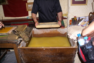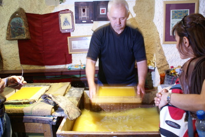 Ohrid gölü, benim fotoğraflarda gördüğüm gibi sessiz sakin değil bugün. Sıkı bir rüzgar var. Sahilde Aziz Clement’in dev bir heykeli var. Aziz Clement heykeli, elinde Ohrid şehri ile birlikte yapılmış, şehrin simgesi anlamında. Dar bir sokağa girdik. Cengiz, sağ yanımızda olan eski binanın Elveda Rumeli’deki kaymakamın evi olduğunu söyledi. Yola devam ediyoruz, sağda dükkanın bir tanesine girdik. Sabah sabah bu rehber ne yapıyor derken, meğerse eski teknik kağıt yapımını izleyecekmişiz. İlginç bir deneyim oldu.