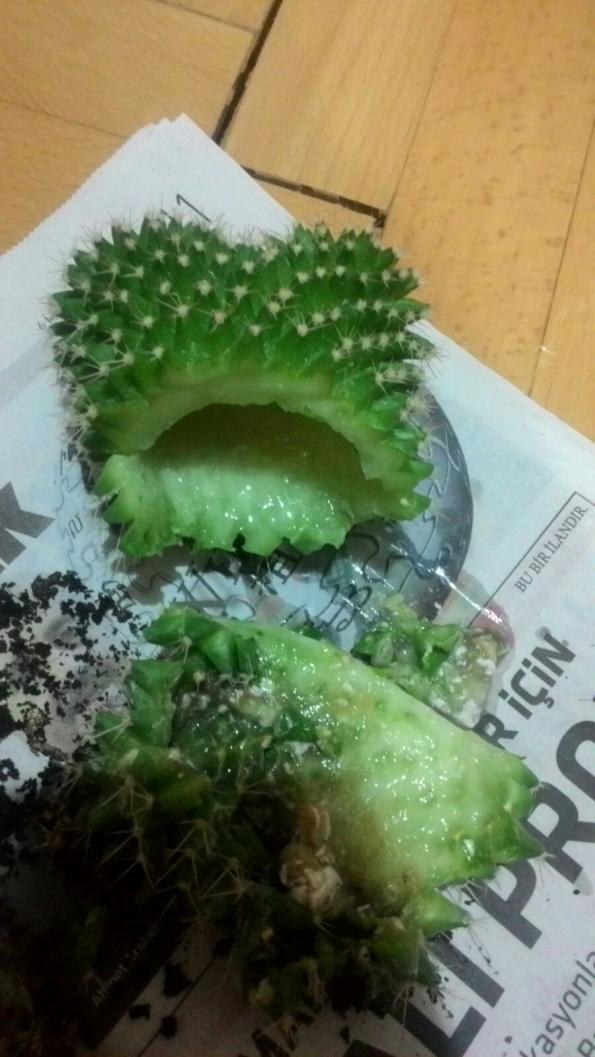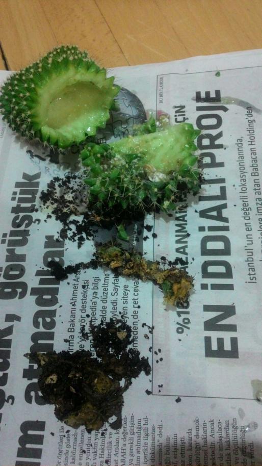 | Merhaba arkadaşlar, Kaktüsümüz bir süredir yan yatıyordu, bizde sürekli taşla destekleyip düzeltiyorduk ama geçenlerde farkettikki kaktüs yumuşacık olmuş. Çekip çıkardığımızda kökünün çürüdüğünü, içininde boşaldığını gördük. Fotoğraflarda görüldüğü gibi kesip içindeki çürük kısımları boşalttık, bi kağıdın üzerine koyup karanlık bi odaya koyduk ama doğrumu yaptık size sormak istedim. |