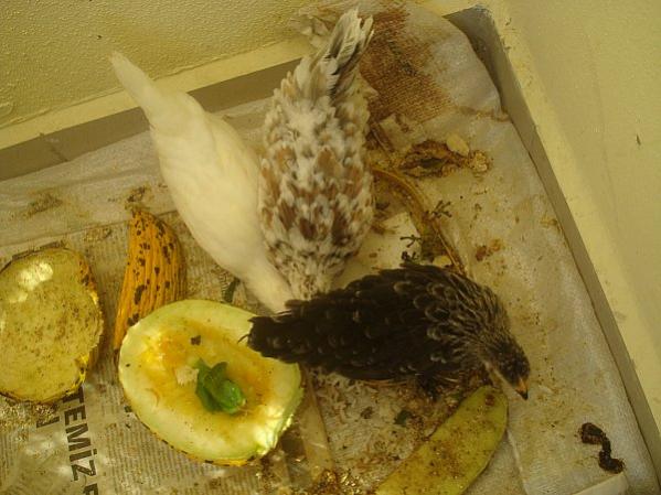 Balkonda gezinmeyi seviyorlar... Eklenti 334426 Eklenti 334427 Pamuk gibi, tertemiz tüyleri var, adı da Pamuk oldu zaten. Eklenti 334428 Almeda'nın tüyleri çok güzel oldu, hiç böyle renkli bir civcivim olmamıştı. Eklenti 334429 En çok pilav ve kavunu seviyorlar.. ;) .Salatalık kabuğu, marul, ıslanmış ekmek favori yiyecekleri, ıslanmış ekmekle civciv yemini karıştırıp biraz da bütün buğday ilave ediyorum. Hangisi tavuk, hangisi horoz tam belli değil ama Kahvecik tavuk, Pamuk'la Almeda horoz galiba. (isim değişikliği olacak;) ) Eklenti 334430 |