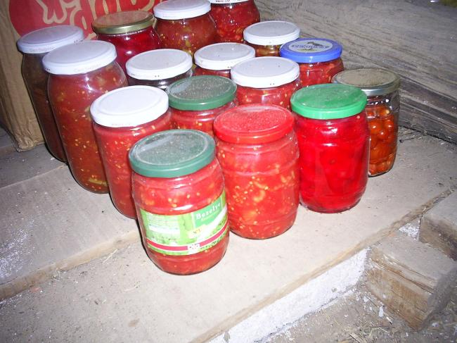 sayın malina.kışlıklarımızın saklandığı kavanozlardan bazılarında küçükparçalar şeklinde doğranmış domatesler , domates ilacı ve az miktarda tuz eklenerek saklananlar var.ön sırada soldan sağa üçüncü kavonozda ayva reçeli var(ayvaların çekirdeklerinde de vitamin olduğunu düşünen eşim çekirdekleri de reçele kattığı için reçelin kırmızı renk aldığını söyledi).ön sırada en sağdaki kavonozdada bahçemin bir köşesinde yetiştirdiğim minik domatesler var.onların da kendilerine has ekşimsi bir tadı var.hoşumuza gittiği için kışa saklamayı deniyoruz.ayrıca sert rüzgarlarda dökülen henüz kızarmamış domateslerimizi de turşumuza katıyoruz.