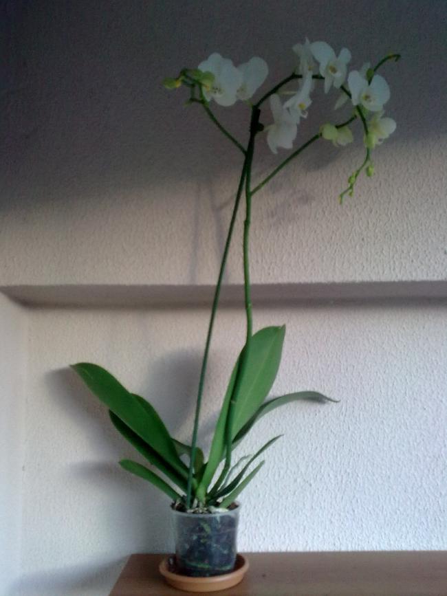 orkidemi salonda 13.00den güneş batana kadar güneş gören bir yere koydum. perdededn süzülen güneşi almakta. orkideyi her gün nemli tutmaya çalışıyorum, kuruyan toprağa ve yapraklarına su püskürtüyorum, çiçeklerine hiç dokunmuyorum ve su ile ıslatmıyorum. yaklaşık 2,5 aydır 20 tane çiçeği var, son bir aydır yeni kök çıkarmakta, hava kökü ise uzamakta, ayrıca yeni bir yaprak çıkarmaktadır. aldığımdan beri hiçbir besin vermedim. saksısını değiştirmedim.
