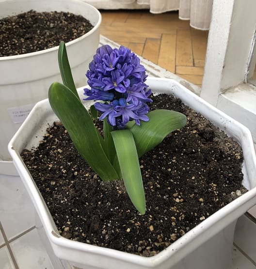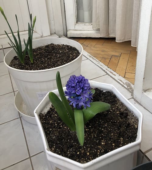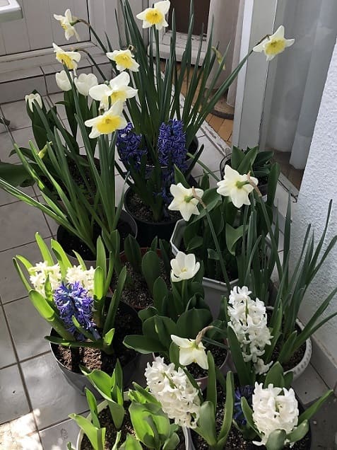 Kasım 2021'de ektiğim sümbül soğanlarının, yılın aşağı yukarı bu zamanlardaki gelişimi: Hem bitkiler tam boy uzamış hem de çiçekler çoktan gövdelenmiş.