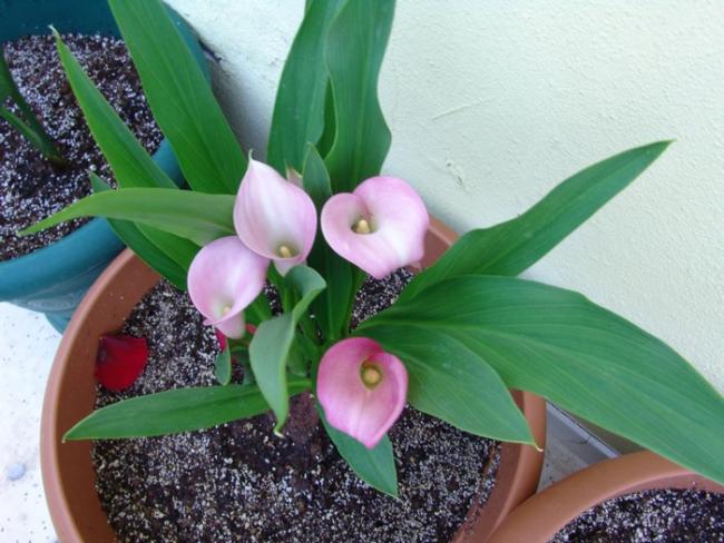 Benim renkli gallalar sürekli çiçek veriyor. Kırmızı olan iyice çıldırmış durumda. Beyaz gallanın çiçeği 1 hafta sonra pörsürken renkli olanların 3 haftadır dipdiri olması çok şaşırtıcı. Sadece koyu kırmızıdan pembeye doğru bir renk açılması oluşuyor.