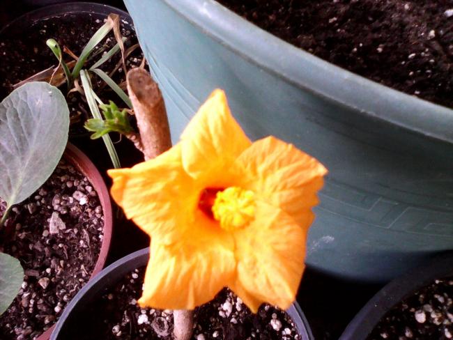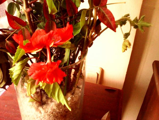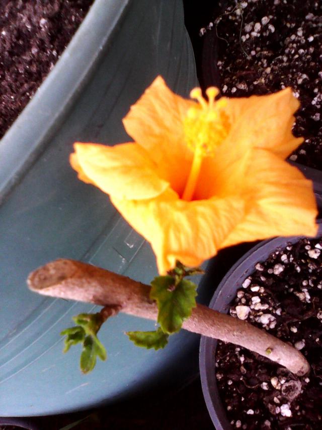 İnanınki ben sökmedim; kopuk, atılmiş bir daldı.O işleri hiç beceremiyorum. Sadece bayramın son günü kapalı bir kebapçının, kaldırımı zaptettiği masaların arasından iki dal hibiscus çeliği aldım :-) Onun da tomurcuğu düştü, dibine bıraktım. Minik de olsa açıyor. İnşallah iki çelik de tutar :-) |