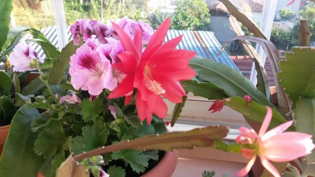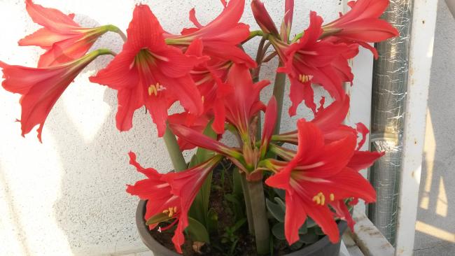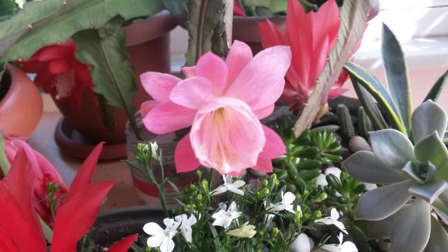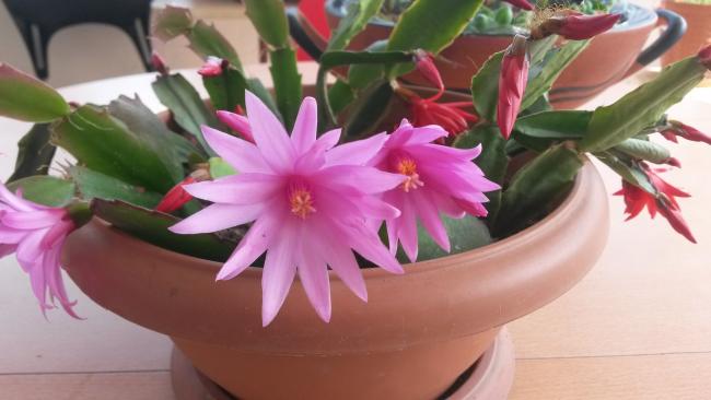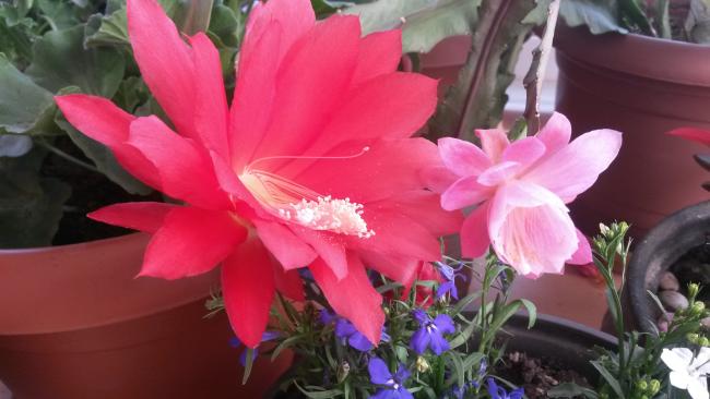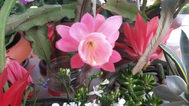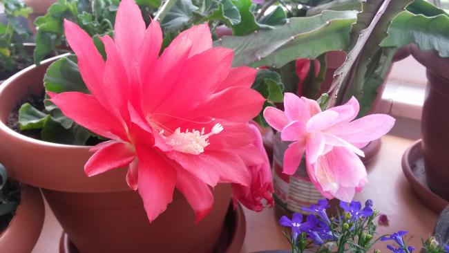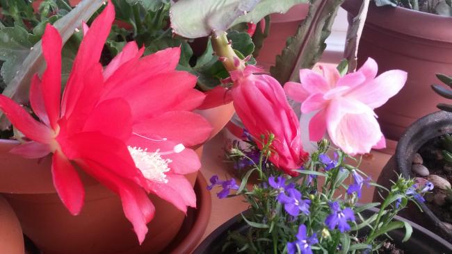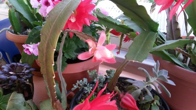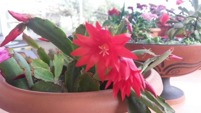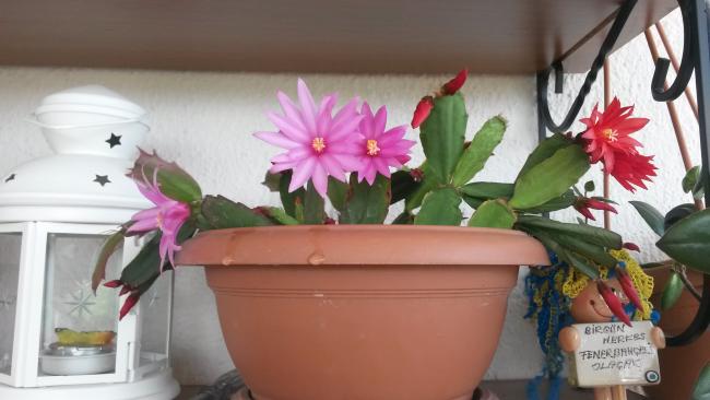 Paskalyalarım. Pembe paskalya bana sürpriz oldu. Annemden çelik getirip saksının kenarına sokuvermiştim. Unutmuşum. Açınca çok sevindim. Kırmızı olan ise yıllardır benimle, çok yaşlanmıştı. Tazelenmesi için bütün dallarını kırıp çelik yaptım. Çok şükür hepsi tuttu ve çiçek açıyorlar...